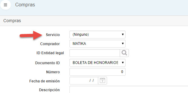 - En esa pestaña se debe seleccionar el Servicio (creado Previamente) que se va a asociar a la nueva compra