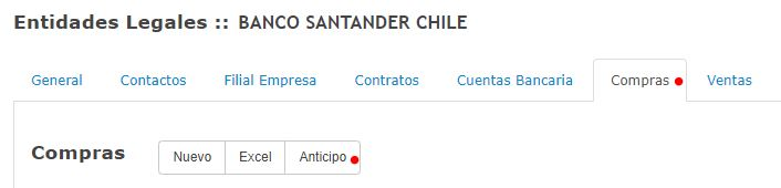 - Ir a Entidad Legal, buscar la Entidad legal a la que se le va a agregar el anticipo y luego a Compras de esa Entidad Legal