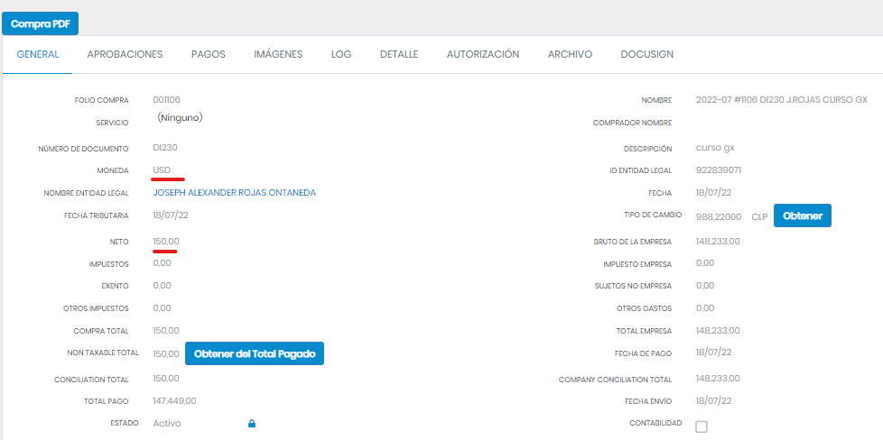 3.- Ingresar al folio en el que se quiere generar el pago al extranjero. Generalmente debiese ser un folio en USD para el pago de una "Invoice" o "Documento Internacional". En este ejemplo se van a transferir 150 usd a "Joseph" de Ecuador