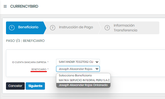 5.- Serás redirigido al paso a paso para crear un pago en Currency Bird. "Joseph" tiene que estar creado como Beneficiario en Currency Bird. En este primer paso se be seleccionar la cuenta Pesos con la que se va a pagar la transferencia y el Beneficiario se debe seleccionar del listado que se cargará con la conección a Currency Bird
