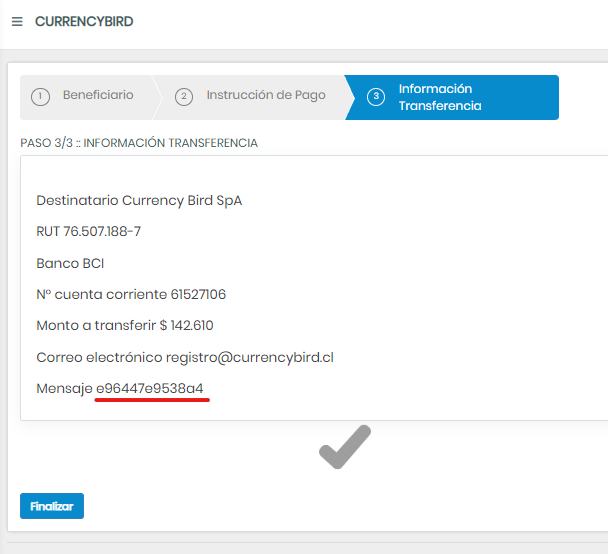 7.- Al ingresar el pago,se entregará un resumen de los datos a transferir junto con un código de transferencia con el cual haremos seguimiento para saber los avances de la transferencia. Hacemos clic en "Finalizar".