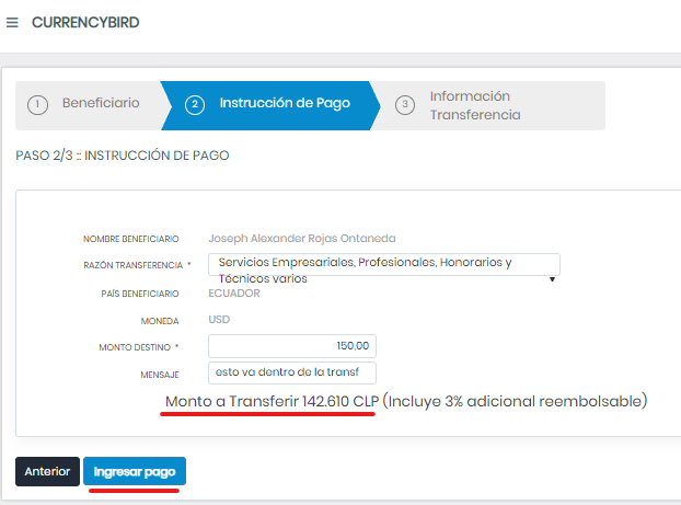 Una vez ingresada la información, aparecerá el monto que se necesita transferir a Currency Bird para que haga la transferencia al extranjero y hacemos clic en "Ingresar Pago"