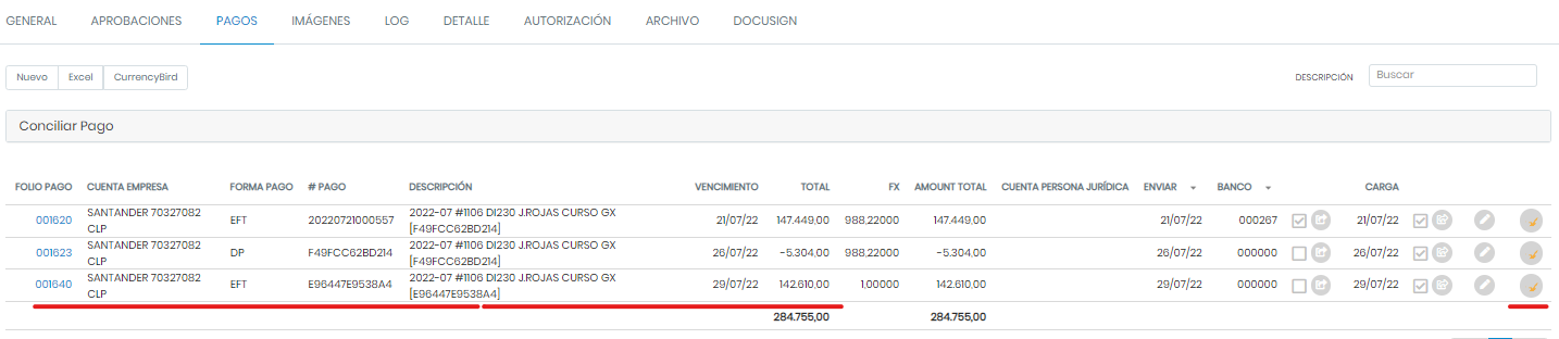 8.- Volverás a la pestaña Pagos del folio de compra y se habrá creado un nuevo pago con todo listo para transferir a Currency Bird. Se debe seguir el proceso de pago de nomina y cargar al banco para hacer la transferencia.