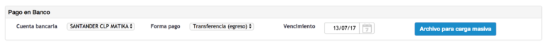 - Seleccionar una fecha de vencimiento, cuenta bancaria desde donde se quiere hacer el pago masivo y en el campo Forma de Pagos, seleccionar la opción Transferencia (egreso).