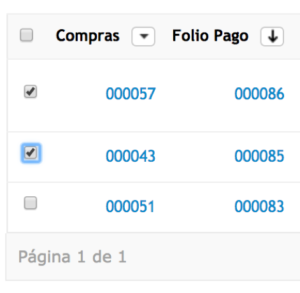 - Una vez ingresado los parámetros en el panel de Pago en Banco, debe seleccionar cada registro que se muestra en el listado y se desee pagar. Para esto, debe hacer clic en el cuadrado a la izquierda de cada fila y verificar que quede con un ticket.