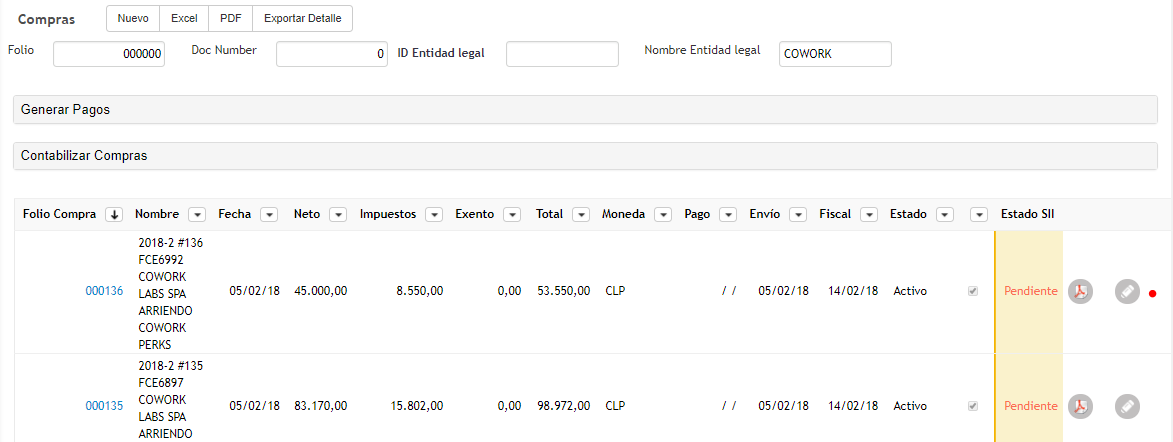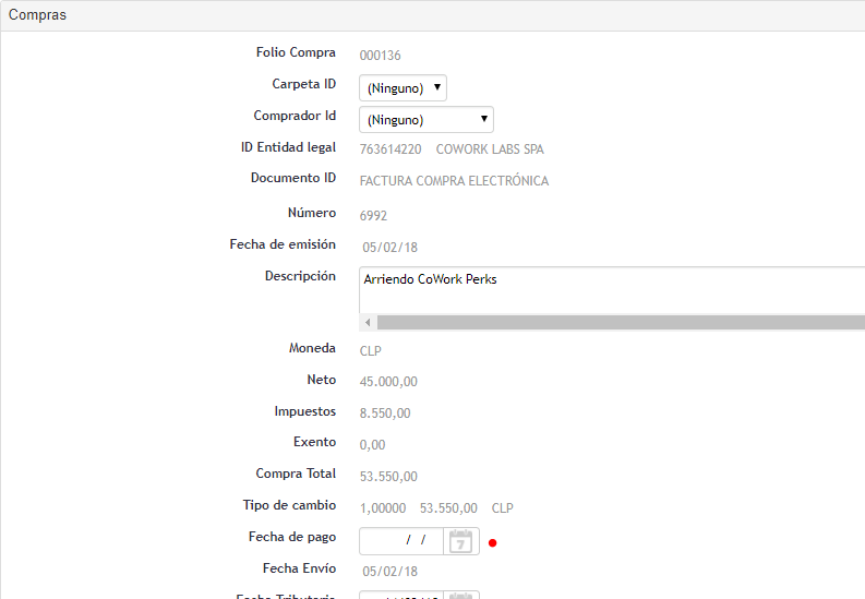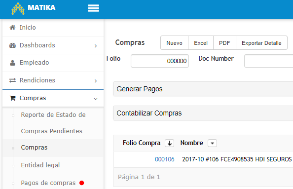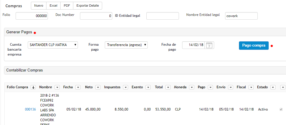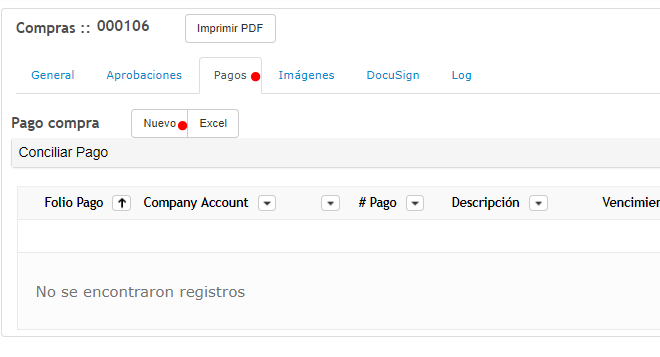 - Ingresar en el folio de compra y hacer clic en Pagos/Nuevo