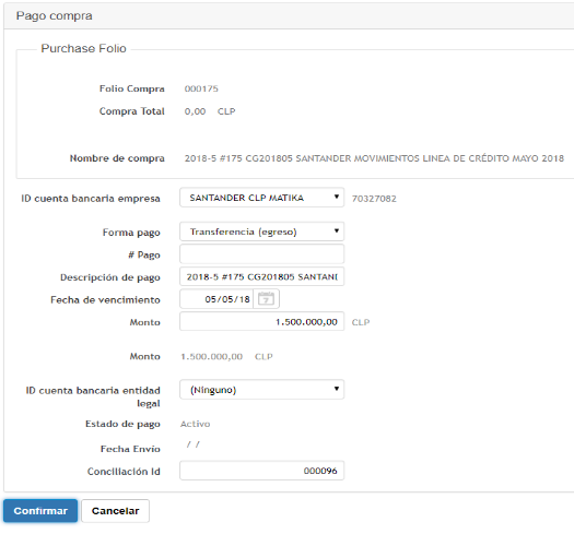 En este caso agregamos en ID Cuenta Bancaria, el banco correspondiente; en la Forma de Pago, Transferencia (egreso); en la Fecha de Vencimiento, la fecha del movimiento bancario; en el Monto, el importe correspondiente al cargo y por último en Conciliacion ID el numero que aparece como ID en la Cartola Bancaria de Matika. En este caso será 96