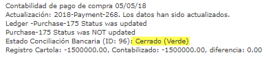 Con este mensaje podemos estar seguros que el movimiento en la cartola ha sido conciliado. Si nos aparece un status distinto, significa que no se ha hecho el procedimiento correctamente, y debemos editar el pago y revisar cual es el error.