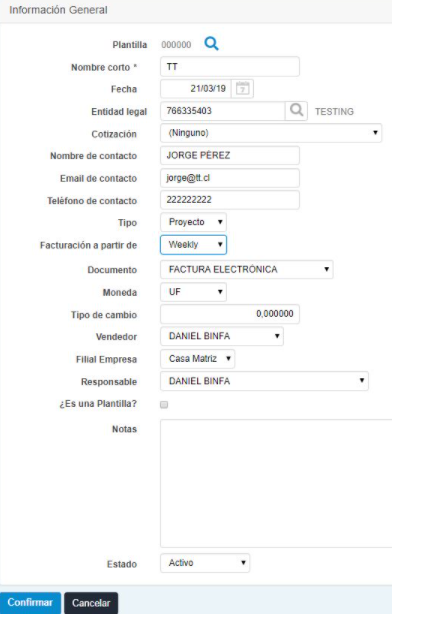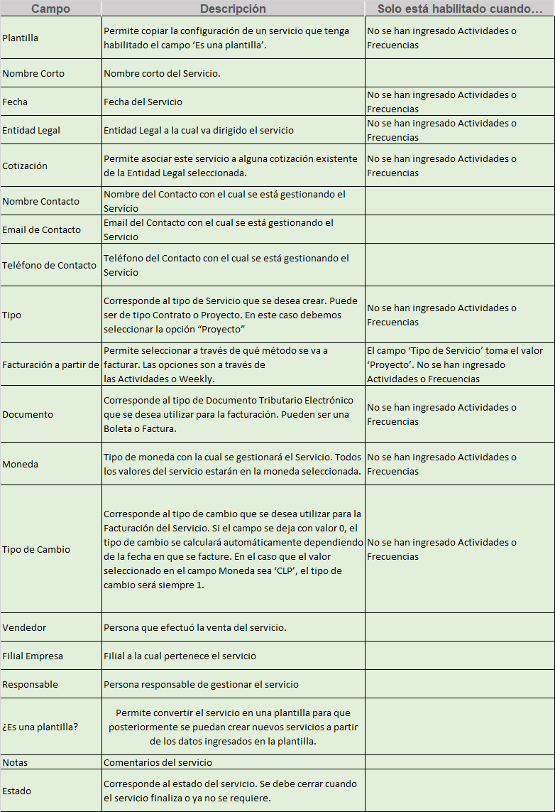 Cuando se tiene un servicio de carácter temporal, con un plazo definido, en donde se necesite facturar dependiendo del avance que va teniendo o en su totalidad, cuyo valor pueda estar pactado en monedas como UF, USD, EUR o simplemente Peso Chileno, entonces el Servicio de tipo Proyecto es el adecuado para configurar. Los servicios de tipo Proyecto se pueden gestionar de dos maneras; a través de las Actividades o los Weekly.