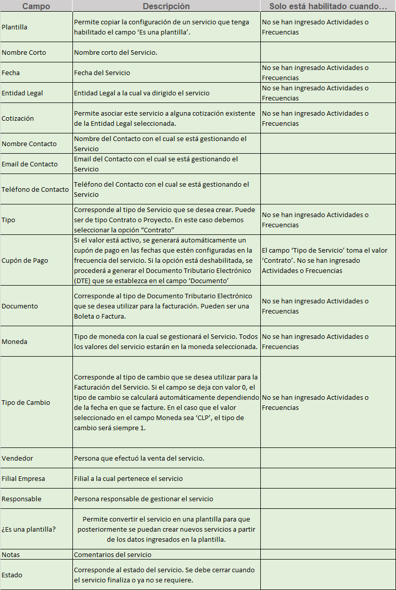 Cuando se tiene un servicio recurrente, en donde se necesite facturar mensualmente o en ciertos meses del año una cantidad definida, cuyo valor puede estar pactado en monedas como UF, USD, EUR o simplemente Peso Chileno, entonces el Servicio de tipo Contrato es el adecuado para configurar. También existe la posibilidad de generar un cupón de pago antes de facturar el servicio.