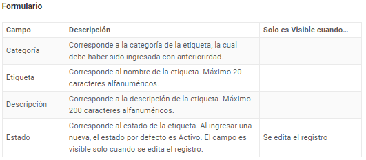 Para poder crear una Etiqueta, es necesario haber creado una Categoría Etiqueta