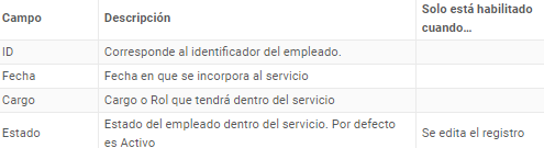 Corresponde a todos los empleados que participarán en el servicio, de tal manera de poder brindarles acceso para la gestión de éste.