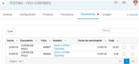 - Cuando el Servicio es de tipo Contrato se pueden emitir Facturas, Boletas y Cupones de Pago. Estos Documentos se emiten a partir de la Frecuencia.