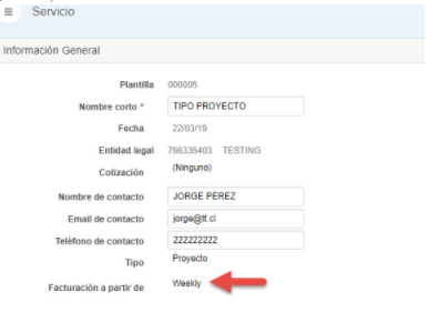 - Cuando el Servicio es de tipo Proyecto se pueden emitir Facturas y Boletas a partir de la Actividad o del Weekly. (Esta opción se selecciona en la pestaña General del Servicio en “Facturación a partir de”)