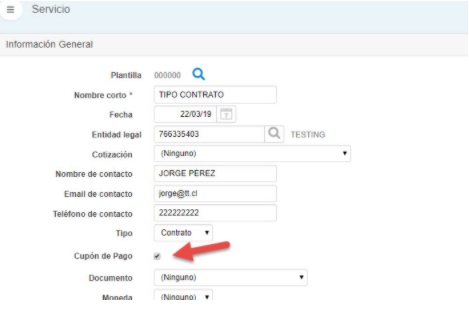 - Al crear un Servicio de tipo Contrato, se debe hacer clic en el cuadro que aparece a mano derecha de Cupón de Pago. (Sólo es posible crear un cupón de pago en un Servicio de tipo Contrato